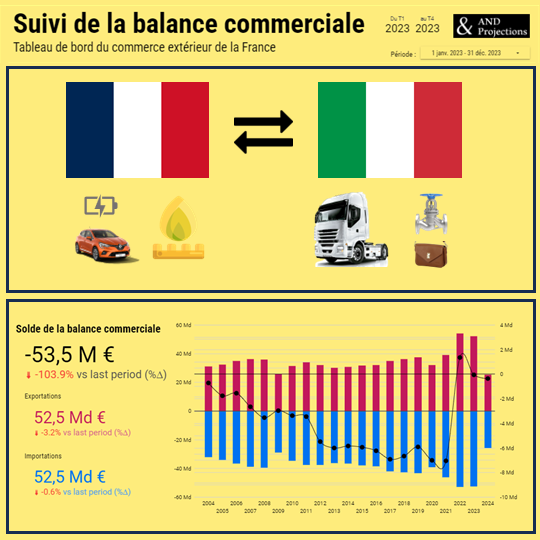 La balance commerciale de la France vis-à-vis de l’Italie connait un solde légèrement déficitaire d’environ 53,5 millions d’€, qui s’est nettement amélioré depuis 2022
