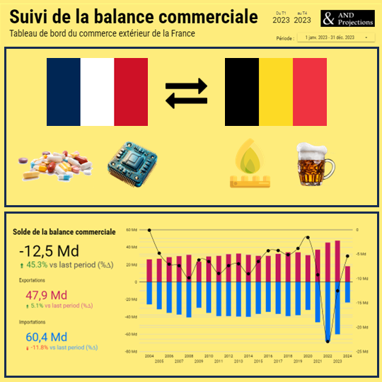 La balance commerciale de la France vis-à-vis de la Belgique connait un solde déficitaire d’environ 12,5 Milliards en 2023 et qui a connu un plus bas historique en 2022..