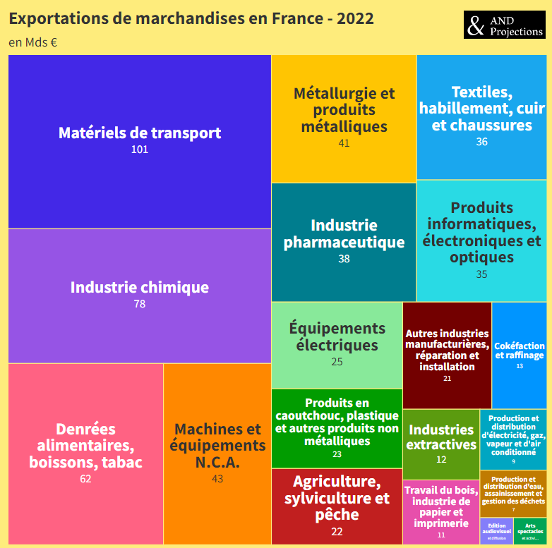 🚚 En 2022 la France a exporté environ 580 Milliards d’euros de marchandises. Sur ce total, plus de 17% sont générés par les exportations de matériels de transports (avions, bateaux, voitures, motos etc…), 13% sont générés par l’industrie chimique et un peu plus de 10% par la vente de produits alimentaires de boissons et de tabac.