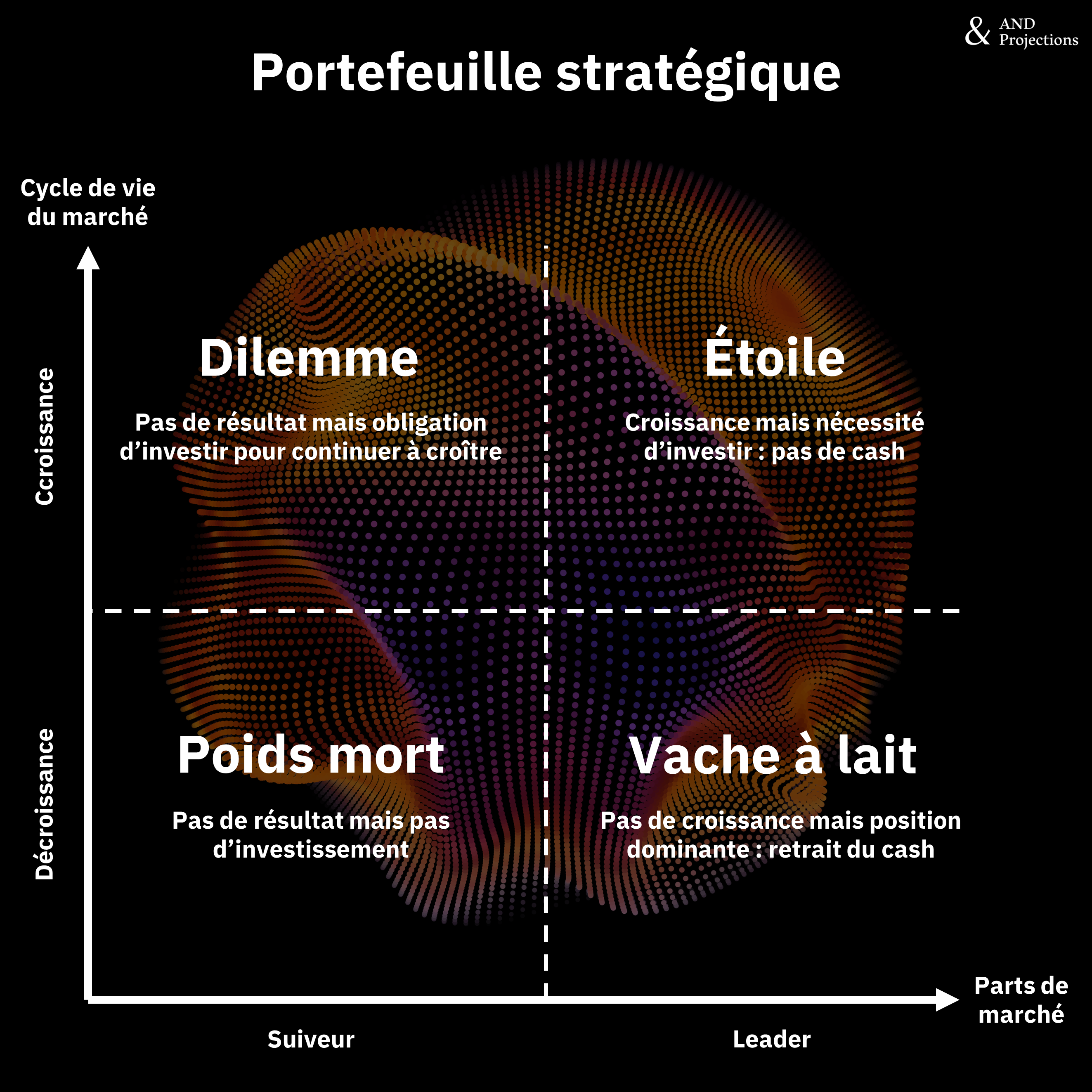 Le 4ème pilier est la synthèse des 3 précédents et doit permettre le positionnement de l’entreprise sur l’axe du cycle de vie métier et l’axe de la part de marché. Ces 2 axes forment un cadran stratégique sur lequel se positionner.