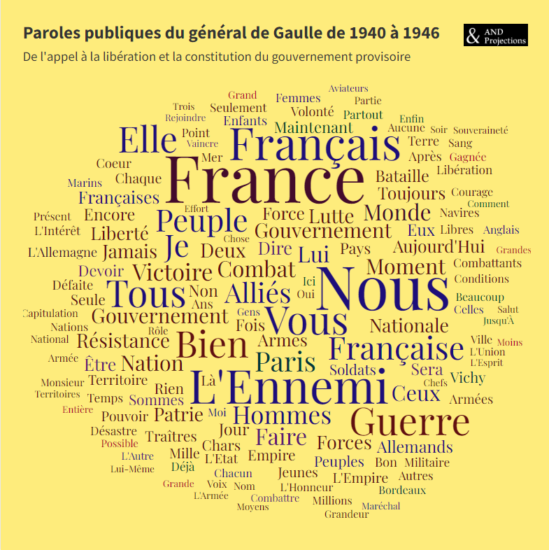 🗣 A l’occasion cette lecture passionnante, je vous partage le nuage des 150 mots les plus employés par le général de Gaulle dans ses prises de paroles publiques de 1940 à 1946. La taille des mots représentant, en proportion, leurs nombres d’occurrences.