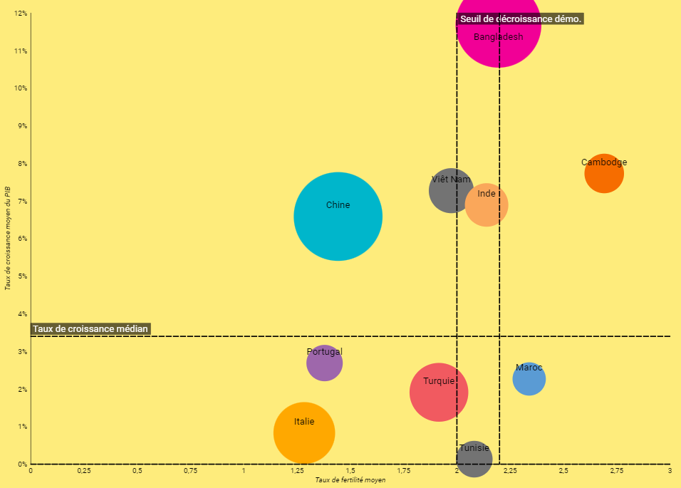 La matrice d'analyse stratégique positionne les partneraires économiques sur l'axe de la croissance économique et sur l'axe de la croissance démographique, constituant ainsi des blocs d'analyse permettant de qualifier les partenaires économiques et d'évaluer en un clien d'oeil la pertinence stratégique.