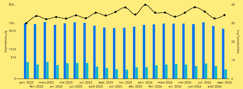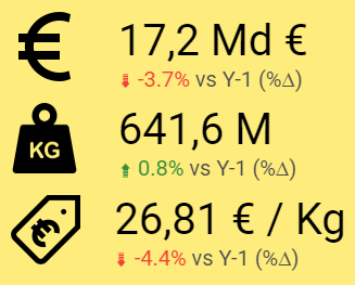 Explorez des insights précis grâce à trois indicateurs clés : la valeur en euros (€), le poids des échanges, et le prix par kilogramme. Suivez les progressions d'une année à l'autre (Y-1) et prenez des décisions éclairées, quel que soit le niveau de détail souhaité.