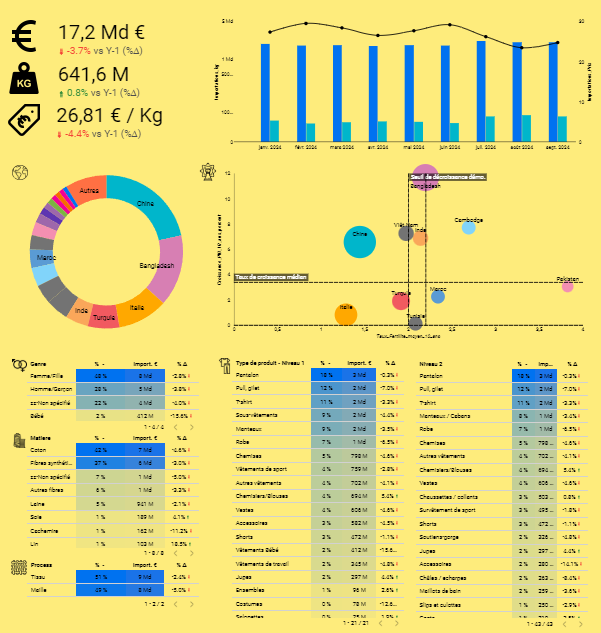 "Textile Trade Insights" vous offre aussi bien une vue d'ensemble du commerce extérieur qu'un regard très précis sur des catégories de produits. Basé sur des données open source, enrichies et croisées de manière originale, "Textile Trade Insight" est l'outil incontournable des décideurs pour supporter leur reflexion stratégique.